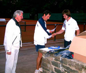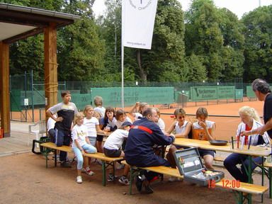 Wieder einmal hieß es am 18. September 2004 - "die Clubmeisterschaften 2004 sind eröffnet". Nach einer kurzen Ansprache des Vereinsvorsitzenden Claus Tanneberger und der Bekanntgabe der ersten Auslosungsrunde durch unseren Sportwart Andreas Becher begannen an einem spätsommerlichen Tag die ersten Spiele. Gespielt wurde in 3 Altersklassen- Damen, Herren und Herren 40. Mit je 12 Tennisbegeisterten Vereinsmitgliedern in jeder Altersklasse war es eine gut besuchte Clubmeisterschaft. Wer seinem Schläger eine neue Saite verpassen wollte - konnte dies vor Ort durch die Firma Völkl machen lassen (vertreten durch Michael Singer). Zudem wurden auch Testschläger bereitgestellt. Andreas Hahn vom Intersport GÜ-Sport am Rosenhof gab jedem Interessierten passende Tipps - welcher Schlägertyp für welchen Spieler in betracht käme. Rückblickend war dies ein rundum gelungener Tag - bei dem man noch einmal die Sonnenstahlen richtig genießen konnte ... |