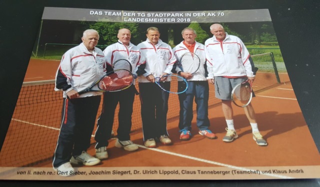 Ungeschlagen zum Landesmeister![]() Im Jahr 2018 hatte die TGS zum ersten Mal eine AK 70er Mannschaft in der Oberliga Sachsens gemeldet. Gut, es waren alles erfahrene Spieler, welche schon vor Jahren Regionalligaerfahrung gesammelt hatten. Dass es aber ein solcher "Durchmarsch" zum Landesmeistertitel 2018 wurde, das hätte nicht einmal der "Käpt’n Tanne" erwartet. Denn die Gegner aus Dresden und den anderen sächsischen Spitzenmannschaften sind alle kein leichtes Kaliber. Jetzt sind die "Alten Herren" schon ein wenig stolz auf diesen Erfolg für unseren Verein. Und weil man ja bei Tennisspielern dieser Jahrgänge nie weiß was als nächstes (Wehwehchen) kommt, hoffen wir auf Gesundheit und die weitere Freude am Sport!