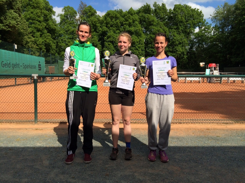 Tolle Erfolge der Stadtpark-Mädels bei den Bezirksmeisterschaften auf heimischer AnlageAn den traditionell zu Pfingsten stattfindenden Bezirksmeisterschaften der Aktiven nahmen dieses Jahr Dominik, Stefan (nur im Doppel) sowie 6 unserer Damen teil. Während es für Dominik im starken Herrenfeld wenig zu ernten gab, galt es für die Stadtpark-Damen in Person von Sandra Wolff sowohl den Titel im Einzel als auch im Doppel zu verteidigen. Als größte Kontrahentin wurde Julia Fenk aus Reichenbach gehandelt. Melanie Groß konnte leider in Runde 1 keine Schützenhilfe leisten und musste sich deutlich geschlagen geben. Auch Michelle Groß und Julia Reichel mussten sich leider in Runde 1 geschlagen geben. Jessica Groß und Annika Rauh gestalteten ihre Auftaktspiele souverän, mussten sich jedoch in Runde 2 gegenseitig eliminieren. Annika startete furios, doch Jessica drehte das Spiel und gewann den Match-Tiebreak deutlich. Sandra kam nach Freilos in Runde 1 richtig schwer ins Turnier, ließ uns Zuschauer ganz schön zittern und musste beim Stand von 2:6 4:5 gegen Julia Ruggaber vom TC Altendorf sogar zwei Matchbälle abwehren. Doch von da an besann sie sich auf ihr Spiel, begann endlich Tennis zu spielen, holte die folgenden Spiele und gewann auch den Match-Tiebreak sicher. In der Nebenrunde gelang es auch Melanie ein Spiel im Match-Tiebreak zu gewinnen ... ja im Match-Tiebreak :-). Am Finaltag waren somit im Halbfinale noch Sandra und Jessica vertreten. Während Sandra, deutlich befreiter spielend als am Samstag, ihr Spiel eindrucksvoll gewann, musste Jessica gegen Julia Fenk antreten. Nachdem der ewig lange erste Satz mit 7:5 gewonnen werden konnte, keimte die Hoffnung auf ein reines Stadtpark-Finale auf, doch Jessica gelang es leider nicht ihr Niveau über das gesamte Match zu halten und im Match-Tiebreak musste sie die Überlegenheit ihrer Gegnerin anerkennen. Während Jessica der Enttäuschung trotzte und sich souverän Platz 3 sicherte, entwickelte sich das erwartet spannende Finalspiel. Nach diversen Breaks zu Beginn musste Sandra mal wieder Satzbälle abwehren, rettete sich in den Tiebreak und gewann Satz 1 doch noch mit 7:6. In Satz 2 stets führend brachte Sandra diesen mit 6:3 nach Hause und konnte so ihren Bezirksmeistertitel nach holprigem Start wieder verteidigen ... herzlichen Glückwunsch. ![]() Von links nach rechts: Jessica Groß ( 3. Platz ), Sandra Wolff ( 1. Platz ) und Julia Fenk ( 2. Platz ) Im Doppel überstanden die zwei gestarteten reinen Stadtpark-Doppel leider die erste Runde nicht, während sich Sandra mit ihrer Schwester Susanne wieder ins Endspiel gegen die Paarung Gläser/Porzig aus Zwickau kämpfte. Als Favoriten in dieses Finale gehend, konnten beide an ihre Möglichkeiten leider nicht anknüpfen und gaben Satz 1 mit 3:6 ab. In Satz 2 konnten sich beide ein bisschen aufraffen und gewannen diesen mit dem gleichen Ergebnis. Sandra war die Müdigkeit aus den drei vorherigen Spielen deutlich anzumerken und so gelang es leider nicht den entscheidenden Match-Tiebreak erfolgreich zu gestalten. Die "Wölffe" mussten somit diesmal mit Platz 2 zufrieden geben. Die Erfolge von Sandra und Jessica sowie einige gewonnen Tiebreaks sollten auch Auftrieb für die beiden noch anstehenden Punktspiele geben. Wir sagen nochmal herzlichen Glückwunsch an unsere Mädels und viel Erfolg bei der Operation Klassenerhalt. Der Vorstand der TG Stadtpark