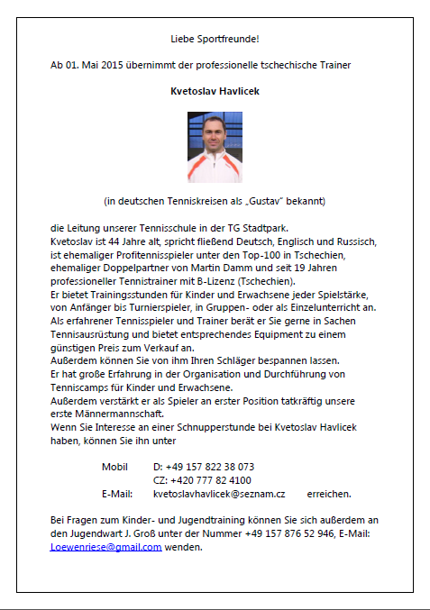 Liebe Kinder & ElternAuf die Plätze, fertig, los! Es ist wieder soweit, die Sommerferien stehen vor der Tür und wir laden alle Kinder herzlich zum Tenniscamp ein. Für unsere kleinen Champions legen wir gleich in der ersten Ferienwoche mit einem 3-tägigen Trainingslager los (13.07.2015 - 15.07.2015). Auch in der letzten Ferienwoche von 17.08.2015 bis 21.08.2015 starten wir ein 5-tägiges Camp. Trainiert wird jeden Tag von 9.30Uhr bis 15Uhr, wobei die Trainer für ein abwechslungsreiches Spiel-, Sport- und Tennisprogramm sorgen werden. Auch für ein warmes Mittagessen wird gesorgt, welches im Preis inbegriffen ist. Bitte seid pünktlich und bringt euch ausreichend Getränke für den Tag mit! Im August-Camp je nach Wetterlage haben wir auch einen Überraschungsnachmittag eingeplant. Preis pro Tag: 25 Euro Anmeldung per E-Mail unter: info@tg-stadtpark.de Euer TG-Stadtpark Trainerteam ![]()