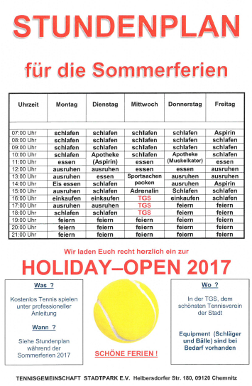 Holiday-Open 2017Während der Sommerferien können alle Tennisinteressierten (von Jung bis Alt) jeden Mittwoch ab 16 Uhr zum kostenlosen Schnuppern auf unserer Anlage vorbeischauen. Kommt in den Stadtpark, sammelt erste Erfahrungen oder testet, was ihr nach längerer Pause noch drauf habt. Wir freuen uns auf euch. ![]() |