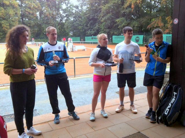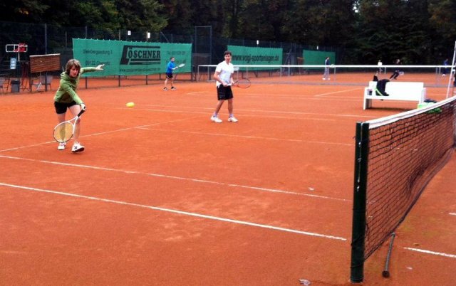 Mixedturnier 2015Am 26.9. fand das zweite Stadtparker Mixed-Turnier statt. Nach erfolgreicher Premiere vor zwei Jahren, konnte in diesem Jahr ein Feld von 8 Mixed-Paarungen zusammengestellt werden. Nach 30-minütigen Gruppenspielen standen die Halbfinalpaarungen fest, während die anderen Teams die Plätze 5 bis 8 ausspielten. Nach hochklassigen und spannenden Halbfinal- und Finalpaarungen ergab sich die folgende Reihenfolge: 2. Platz: Melanie Groß & Jannis Pein 3. Platz: Annika Rauh & Stefan Thämmig ![]() 8 Paarungen traten gegeneinander an. ![]() ![]() Sogar 2 Paarungen aus der Jugend gingen an den Start. Obwohl der Spaß an diesem Tag im Vordergrund stand und es das Wetter phasenweise nicht so gut mit uns meinte, wurde sehenswertes Tennis geboten und um jeden Ball gekämpft. Als Belohnung gab es viele nützliche Dinge zu gewinnen. ![]() |