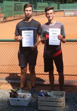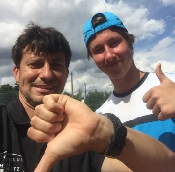 Erfolgreiches Turnier-Wochenende der StadtparkerAm bislang turnierreichsten Wochenende des Jahres ließen auch wir Stadtparker es uns nicht nehmen an einem dieser Turniere teilzunehmen. Julia Kubb reiste nach Dresden zum SV Dresden-Mitte-Cup, einem DTB-Turnier, das zur Serie um den Dunlop-Cup Ost zählt. Nach Lospech eine Woche zuvor beim Bucher Cup in Reichenbach, erwischte Julia zwar in Runde 1 erneut eine LK 1 (Nr. 468 Deutschlands). Doch mit Julia Fenk vom VTC Reichenbach, der Bezirksmeisterin des letzten Jahres, stand ihr eine Gegnerin gegenüber, die sie seit gefühlten Ewigkeiten kennt und schon häufig geschlagen hat. Entsprechend motiviert startete Julia ins Turnier, zumal auch in Runde 2 keine der ganz großen Favoriten wartete. Es entwickelte ein enges Match, Julia behielt in den wichtigen Phasen die Nerven und siegte letztlich 7:5 4:6 und 10:5. In Runde 2 schaltete Julia anschließend mit Luise Reinhardt aus Erfurt die zweite LK 1 sicher mit 7:5 6:2 aus und buchte so den Einzug ins Halbfinale, bereits ein toller Erfolg. Am Sonntag musste sie dann gezeichnet von den Strapazen des Vortages die Überlegenheit ihrer Dresdner Kontrahentin Ann Kathrin Wirlitsch anerkennen. Wir gratulieren zum ausgezeichneten Turnier und dem glänzenden dritten Platz. Während Julia in Dresden als Einzelkämpferin unterwegs war, starteten beim TC Plauen-CUP gleich 6 Stadtparker. Im 27-er Herrenfeld mussten am Freitag Nachmittag zunächst Maxim und Basti antreten. Beide taten sich nach gutem ersten Satz im zweiten schwer, konnte ihre Auftaktgegner jedoch beide in die Schranken weisen. Jörg und Stefan (an Position 4 bzw. 5 gesetzt und mit Freilos in Runde 1) reisten am späten Nachmittag auch nach Plauen, sodass das Übernachtungsquartier mit Wohnwagen und Zelt hergerichtet werden konnte. Am Abend stieß auch Jannis hinzu, der sein Erstrundenmatch aufgrund der Arbeit erst am Samstag früh bestreiten konnte. ![]() Basti bekam es mit René Herzog, der Nummer 2 der Setzliste, zu tun, nutzte die anfänglichen Schwächen des Dresdners aus und sicherte sich überraschend Satz 1. In Satz 2 alles andere als chancenlos konnte Basti leider seine Chancen nicht nutzen. Im abschließenden Champions-Tiebreak zeigte René dann wie er zu seiner LK gekommen ist und ließ Basti keine Chance ... echt schade, zumal in Runde drei ein Stadtparkduell gewartet hätte. Die Auslosung spülte Basti, Jannis und Stefan in ein Viertel, sodass Jannis und Stefan bereits in Runde 2 aufeinander trafen und Basti im Viertelfinale gewartet hätte. Wie so oft schlug Jannis' Vorhand regelmäßig ein, mal im Feld, mal daneben und mal im Zaun. Letztlich fehlte in den entscheidenden Phasen etwas die Konstanz und Stefan gewann das Stadtparkduell 6:4 6:1. Am späten Samstag Vormittag stieß als letzter auch Marcel hinzu. Als Nummer 1 des Turniers stellte sein Auftaktgegner meine Hürde dar. Anders erging es Maxim und Jörg. Maxim musste sich mit einem starken LK 12-er aus Greiz messen, der in Runde 1 stark aufgespielt hatte. Hoch motiviert mit der Aussicht auf LK 12 kämpfte Maxim und rang seinen Kontrahenten im Champions-Tiebreak nieder. Jörg warf anschließend in einem spannenden Match einen Plauener mit dem ähnlichen Ergebnis aus dem Turnier. Nach längerer Pause fanden am Samstag Abend die Viertelfinals statt - noch 4 Stadtparker, ein reines Stadtparkhalbfinale wäre möglich gewesen. Auf Marcel, Jörg und Maxim wartete jeweils ein Plauener, auf Stefan besagter René Herzog. Marcel spielte seinen gewohnten Stiefel runter und zog mit einem Zweisatzsieg ins Halbfinale ein. Auf Jörg wartete mit Plauens Nummer 1 eine völlig offene Partie, die er leider nicht zu seinen Gunsten gestalten konnte. Stefan hielt gegen René Herzog, der nun auch längere Phasen wie eine LK 8 spielte, in beiden Sätze bis zum 3:3 gut mit, musste sich dann jedoch jeweils geschlagen geben. Maxim erwartete eine LK 23, gar nicht so einfach für den Kopf. Nach starkem ersten Satz spielte dieser leider im zweiten einen kleinen Streich, doch Maxim rettete sich ins Ziel und damit ins Halbfinale. In diesem Halbfinale durfte sich Maxim als dritter Stadtparker an René Herzog versuchen, nun musste er doch mal fällig sein. Vor den Halbfinals gab es zunächst am Samstag noch ein paar Ständchen von Mark Forster, dessen Konzert auf der Parkbühne im ganzen Plauener Stadtpark prima zu hören war sowie eine erholsame Nacht. In Halbfinale 1 fegte Marcel die Plauener Nummer 1 Sebastian Matthes mit 6:0 6:1 regelrecht vom Platz. Maxim startete hochmotiviert und konzentriert ins Match und holte sich völlig verdient Satz 1 mit 6:3. Zu Beginn des zweiten Satzes spielten beide nicht auf höchstem Niveau, Maxim ließ einige Chancen ungenutzt und verpasste es, sich entscheidend abzusätzen. So kam es, wie es kommen musste ... wieder ein Championstiebreak, zuletzt eine Stadtparkschwäche, in Plauen die Quote schon deutlich verbessert. Es ging hin und her, Liveticker per Whatsapp an die bereits abgereisten sowie restlichen Stadtparker und ein Wahnsinnsballwechsel, der Maxim das 9:8 bescherte. Nach dem 10:8 folgte der Siegesschrei, eine richtig starke Leistung und ein Finale Trainer gegen Schützling ... wer hätte das vorher gedacht? Im Finale fiel es Maxim nach der abgefallenen Last zunächst sehr schwer, Satz 1 war mit 6:1 eine klare und schnelle Sache für Marcel. Doch Maxim kämpfte sich in Match und machte Marcel das Leben deutlich schwerer. Bei 3:5, besaß Maxim nach einem sehenswerten Rückhand-Smash die Chance auf 4:5 zu verkürzen, doch Marcel "rettete" sich zum 6:3 und feierte einen Favoritensieg ohne Satzverlust. ![]() Marcel und Maxim vor dem Finale