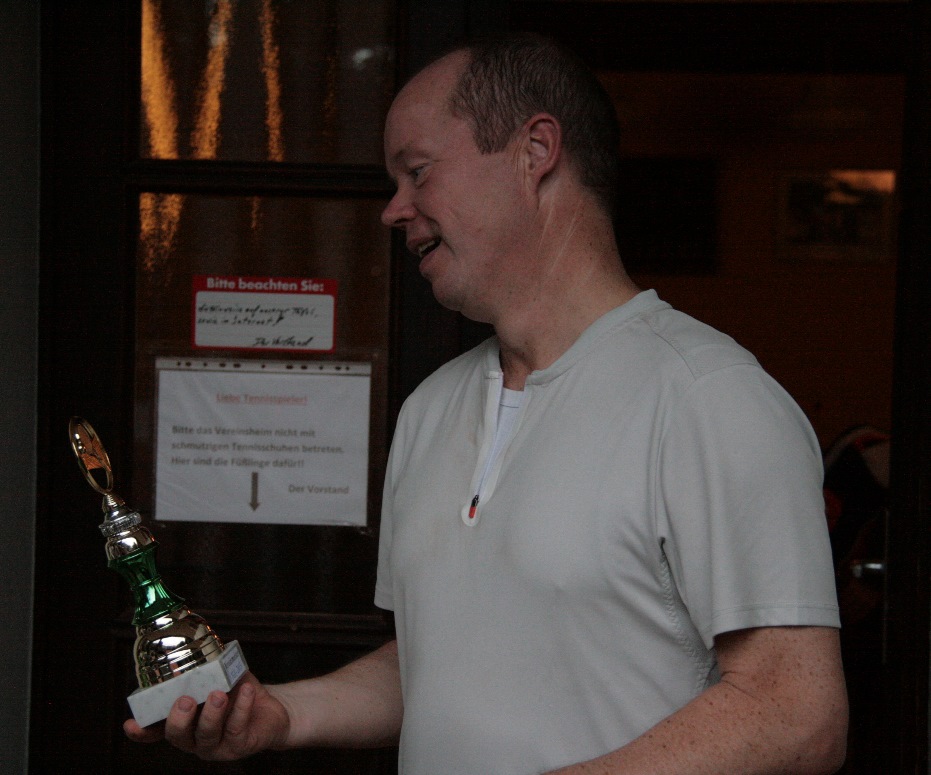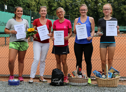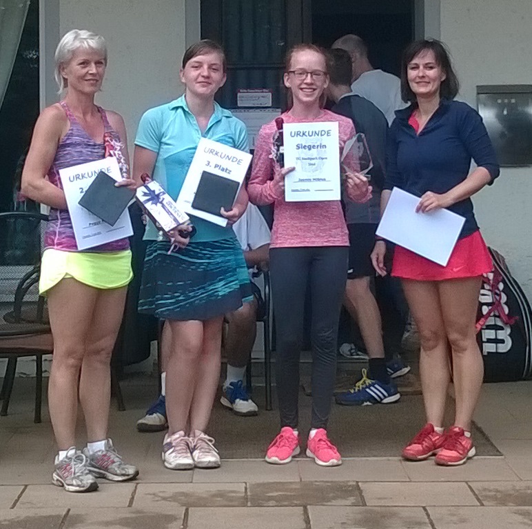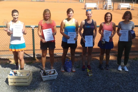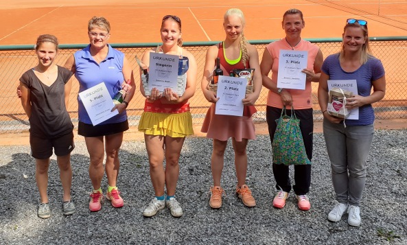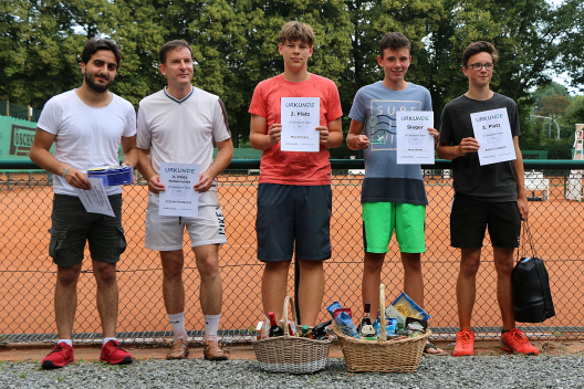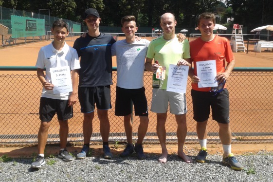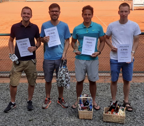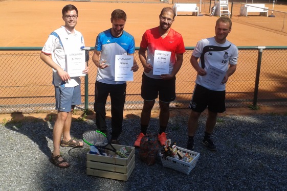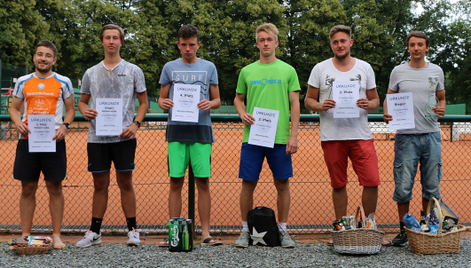 TG Stadtpark Open 2019Nachdem die vierte Auflage der TG Stadtpark Open drei Wochen zuvor aufgrund von Gewitterschauern abgesagt werden musste, wurde am 3./4. August ein neuer Anlauf gestartet.Drei Wochen so gut wie kein Regen und pünktlich am Freitagabend setzt ein länger anhaltender heftiger Gewitterschauer ein. Doch diesmal hielten die Plätze dem Regen stand und ohne Pfützen konnte das Turnier beginnen. Aufgrund der passenden Teilnehmerzahlen von 12 im Herren A-Feld, 8 im B-Feld und 6 im Damenfeld und um möglichst vielen Spielern 4 Spiele am Turnierwochenende zu ermöglichen, wurde in allen drei Konkurrenzen in Gruppen mit Endrunde gespielt. In den vier Dreiergruppen des Herren A-Feldes traten die Stadtparker Lucas, Maxim und Jörg an. Unterstützt wurden sie vom Glauchauer Alexander Fröhlich, der seit einigen Wochen im Stadtpark mittrainiert und ab Winter auch die Mannschaft verstärken wird. Lucas, Maxim und Alexander gewannen ihre Gruppe. Alexander schlug dabei hochdramatisch den an Position 2 gesetzten Zwickauer Daniel Schilling nach Matchbällen auf beiden Seiten denkbar knapp im Championstiebreak. Jörg belegte in Maxims Gruppe Platz 2 und kämpfte so in der Platzierungsrunde am Sonntag noch um Platz 5 und das letzte Präsent. Da Lucas am Sonntag nicht mehr antreten konnte, erreichte Alexander kampflos das Finale. Im zweiten Halbfinale setzte sich Maxim in zwei Sätzen gegen Norman Glintz von der USG Chemnitz durch, der sich mit Platz drei und einem "Ossi-Beutel" trösten durfte. Das Finale war an Spannung und Dramatik kaum zu überbieten. Alexander gewann trotz leichter Dominanz Maxims Satz 1 mit 7:6. Auch der ausgeglichene zweite Satz musste im Tiebreak entschieden werden. Bei einer 6:2-Führung und vier Matchbällen stand Alexander kurz vor dem Sieg. Doch diesmal bewies Maxim Nervenstärke, wehrte alle Matchbälle ab und drehte den Tiebreak zu seinen Gunsten. Im Championstiebreak wechselte die Führung bis zum 6:6 ständig. Doch dann setzte sich Alexander mit 10:7 durch und gewann für viele etwas die Trophäe als Sieger der diesjährigen Stadtpark Open. In der Runde um die Plätze 5 bis 8 musste sich Jörg gleich im Auftaktspiel geschlagen geben und erreichte so Platz 7. ![]() Von links nach rechts: Maxim Kling (2. Platz), Alexander Fröhlich (Sieger), Norman Glintz (3. Platz), Daniel Schilling (5. Platz) Thomas von der IFA gewann seine Vierergruppe vor Namensvetter aus dem Stadtpark, Karl wurde in der Parallelgruppe Zweiter hinter dem Turnierfavoriten Christopher Gail aus dem Küchwald. Im Finale konnte Thomas leider nicht ganz an seine Form anknüpfen und musste sich Christopher doch sehr eutlich geschlagen geben. Dieser erkämpfte sich somit den Siegerpokale und den "Italienischen Korb" und kann nun im nächsten Jahr im A-Feld sein Können zeigen. Das Spiel um Platz 3 gewann Karl gegen Thomas; alles in allem ein toller Erfolg für die Trainigskameraden aus der Spielgemeinschaft. ![]() Von links nach rechts: Thomas Wolfram (4. Platz), Karl Kopiske (3. Platz), Christopher Gail (Sieger), Thomas Wegner (2. Platz) Im Spiel um Platz 3 musste Kerstin Borch (1. TC Waldheim) leider verletzungsbedingt aufgeben. So sicherte sich Simone Geschke (TC Grün-Weiß Röderau) Platz 3 und darf nun Ostprodukte aus dem "Ossi-Beutel" verzehren. Doch auch Kerstin sowie die fünftplatzierte Jeannette Freier (CTC) und Eugenia als sechstplatzierte gingen nicht leer aus. ![]() Von links nach rechts: Eugenia Marga (6. Platz), Jeannette Freier (5. Platz), Susanne Wolff (Siegerin), Laura Lippert (2. Platz), Simone Geschke (3. Platz), Kerstin Borch (4. Platz)