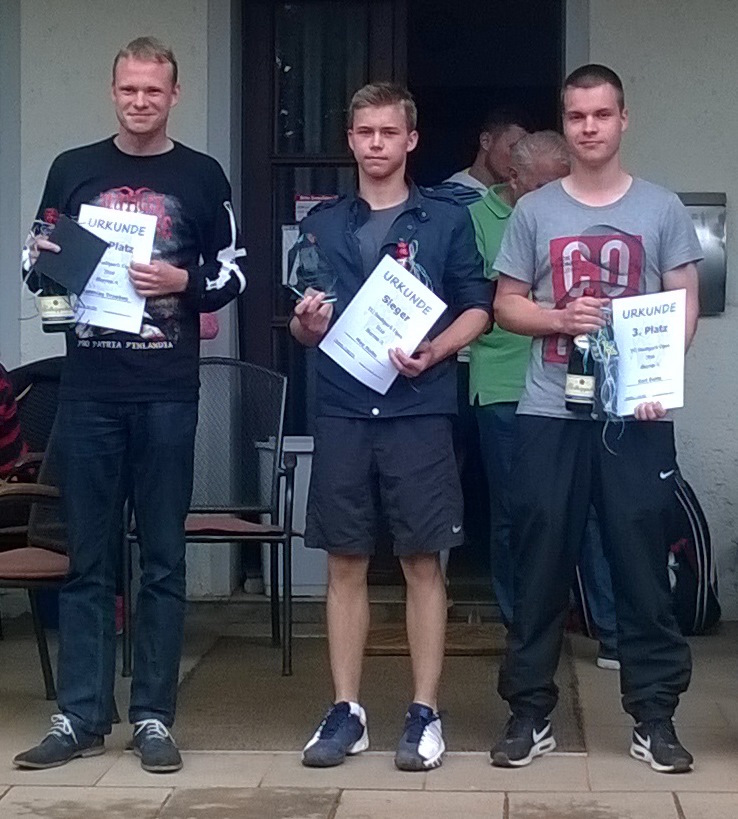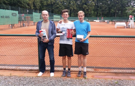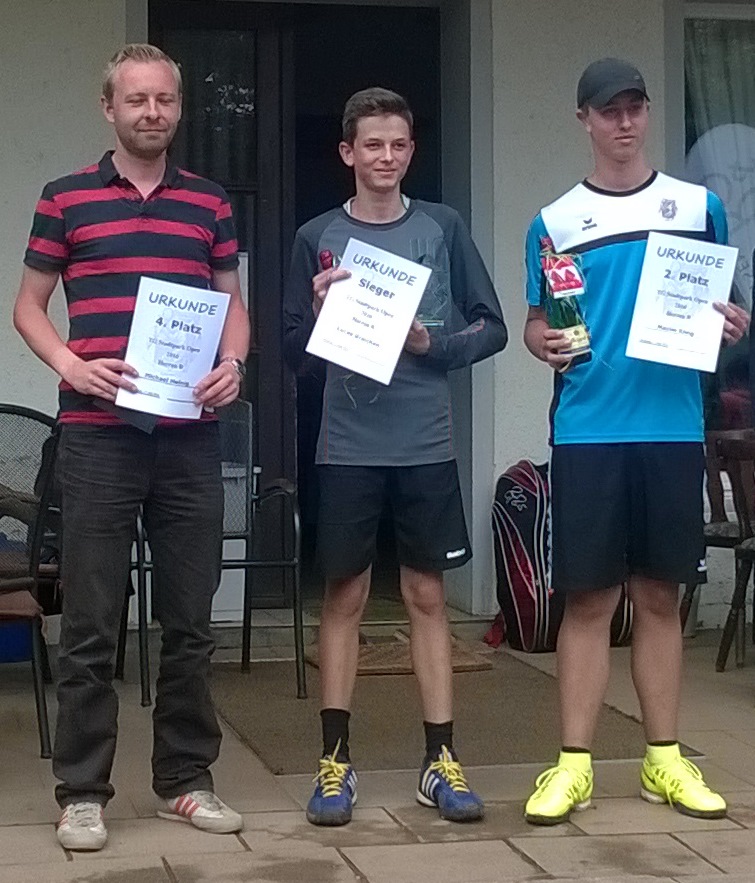TG Stadtpark Open 2016 - die Jugend setzt sich durchAm 16. und 17. Juli fand die Premiere der TG Stadtpark Open als Leistungsklassenturnier der Aktiven Damen und Herren statt. Bei perfekten äußeren Bedingungen trafen sich am Samstag 47 Spielerinnen und Spieler im Chemnitzer Stadtpark, um in drei Konkurrenzen um den Titel zu kämpfen. Obwohl an diesem Wochenende mehrere LK-Turniere ausgerichtet wurden, waren die Starterfelder bis auf eine kurzfristige krankheitsbedingte Absage voll besetzt. Während in der Damenkonkurrenz die topgesetzte 13-jährige Jasmin Möbius vom TC Chemnitz-Altendorf als klare Favoritin ins Rennen ging, im B-Feld der Herren ein spannender Kampf unserer drei Vertreter Maxim, Lucas und Jannis erwartet wurde, wollte sich im sehr ausgeglichen besetzten A-Feld der Herren niemand auf einen Favoriten festlegen. Wie erwartet spielte sich Jasmin Möbius problemlos durchs Tableau und gab bis zum Finale nur zwei Spiele ab. Ihre Finalgegnerin, Peggy Martin vom TC Flöha-Plaue 2000, erwies sich als echte Kämpferin. Sowohl in Runde 1, als auch Runde 2 machte sie einen Satzrückstand wett, kämpfte sich in den Match-Tiebreak und gewann diesen jeweils 10:8. Auch im Finale, welches wie fast alle Spiele am Sonntag aufgrund des widrigen Wetters mit ständigen Regenschauern im Sportcenter am Stadtpark ausgetragenen wurde, kämpfte sie um jeden Ball, musste jedoch die Überlegenheit der Jugend anerkennen und konnte Jasmin kein einziges Spiel abringen. Jasmin durfte sich absolut verdient später über die Siegertrophäe freuen. Das Spiel um Platz 3 entschied Michelle Pelzer vom TC Limbach gegen Denise Bohne vom TC Burgstädt in zwei engen Sätzen für sich. ![]() Von links nach rechts: Peggy Martin ( 2. Platz ), Michelle Pelzer (3. Platz), Jasmin Möbius ( 1. Platz ) und Denise Bohne ( 4. Platz ) Maxim und Jannis dominierten ihre Tableauhälfte souverän und lieferten sich ein spannendes Halbfinale auf sehr gutem Niveau. Leider musste Jannis von Krämpfen geplagt beim Stand von 4:6 und 5:6 aufgeben. Lucas musste ein wenig mehr kämpfen, räumte jedoch mit Tom Neidhardt und Michael Heinig (jeweils TC Limbach) die beiden größten Konkurrenten aus dem Weg und zog ebenfalls ins Finale ein. Im in der Halle ausgetragenen Finale entwickelte sich ein Wechselbad der Gefühle. Nachdem Lucas den ausgeglichenen ersten Satz mit 6:3 für sich entscheiden konnte, zeigte Maxim in Satz 2 sein bestes Tennis und ließ Lucas mit seinem druckvollen Spiel und dem verdienten 6:0 nicht den Hauch einer Chance. Maxim schien auch im Match-Tiebreak den Schwung aus Satz 2 mitnehmen zu können, doch Lucas zeigte starke Nerven, spielte fehlerfrei und gewann das Turnier mit 10:4 im Match-Tiebreak. In Zukunft können sich Lucas und Maxim dann im A-Feld beweisen. Jannis machte mit einem sicheren Zweisatzsieg den kompletten Stadtparktriumph prefekt. Herzlichen Glückwunsch an alle drei. ![]() Von links nach rechts: Michael Heinig ( 4. Platz ), Lucas Graichen ( 1. Platz ) und Maxim Kling ( 2. Platz ) Dominik erwischte gleich den an Nummer zwei gesetzten Matthias Troebes vom TC Blau Weiß Greiz. Trotz guter Leistung musste er die Überlegenheit anerkennen und den Weg in die Nebenrunde antreten. In dieser schlug Dominik drei LK 13er; wir gratulieren zum Sieg der Nebenrunde. In Runde zwei erlebten wir eine zunächst große Überraschung, die sich später jedoch relativieren sollte. Daniel verlor im Match-Tiebreak gegen den 17-jährigen Max Nolte vom TC Bad Weißer Hirsch aus Dresden mit 6:2 2:6 und 7:10. Jörg traf auf Jim Szyszkowski (TC Limbach), den er im Punktspiel klar besiegen konnte. Diesmal erwischte er jedoch keinen guten Tag und konnte dem deutlich clevereren Spiel des Kontrahenten weniger entgegen setzen. Leider konnte auch Sebastian den Halbfinaleinzug nicht perfekt machen und musste sich in einem gutklassigen Match Kurt Eulitz vom Oschatzer TV mit 4:6 7:6 7:10 geschlagen geben. Im folgenden spielten sich Max Nolte und Matthias Troebes bis ins Finale vor, welches Max souverän mit 6:1 6:3 für sich entschied und errang völlig verdient den Titel der TG Stadtpark Open. ![]() Von links nach rechts: Matthias Troebes ( 2. Platz ), Max Nolte ( 1. Platz ) und Kurt Eulitz ( 3. Platz ) Die Teilnehmerinnen und Teilnehmer äußerten sich sehr positiv über die Gastfreundschaft und Verpflegung während des gesamten Turnieres und freuten sich bereits auf eine Fortsetzung im nächsten Jahr.