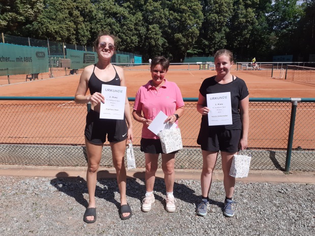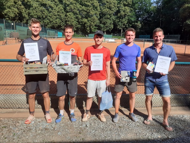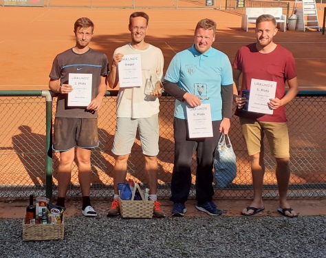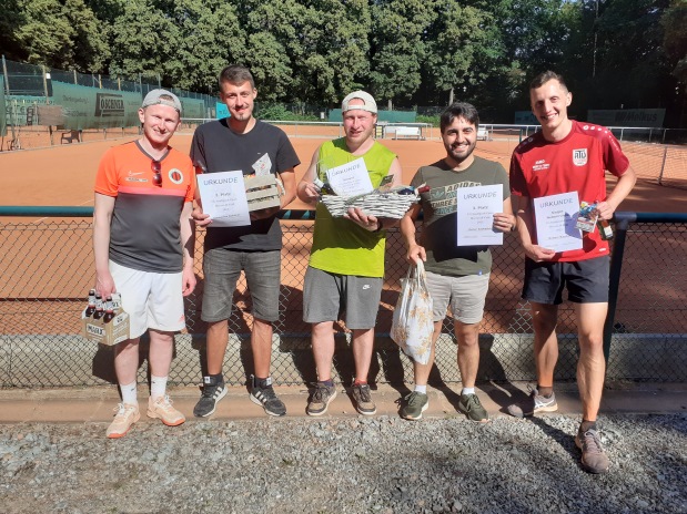 TG Stadtpark Open 2023Am 15./16. Juli fand im Chemnitzer Stadtpark die 6. Auflage der TG Stadtpark Open statt. Im Gegensatz zum letzten Jahr, als jeweils in der Nacht von Freitag auf Samstag Petrus sich nicht als Freund des Stadtparks zeigte und sich die Schleusen öffneten, meinte er es diesmal besonders gut und bescherte den Teilnehmern und Turnierverantwortlichen wunderschönen Sonnenschein. Auf den ersten Blick hätte man von besten Tennisbedingungen sprechen können, aber Temperaturen von über 30 Grad bereits vor dem Mittag ließen in den ersten beiden Runden jeden noch so klaren Sieg zu einer schweißtreibenden Angelegenheit werden.Trotzdem boten die Teilnehmer auf bestens vorbereiteten Plätzen gutes Tennis und glücklicherweise mussten nur wenige den besonderen Bedingungen Tribut zollen. So erwischte es im voll besetzten A-Feld der Herren bereits in Runde 1 mit Marcus Rietig (ATV Leipzig) den Topgesetzten, der sich Marvin Wenzel (CTC Küchwald) überraschend deutlich geschlagen geben musste und anschließend auch nicht mehr in der Nebenrunde antreten konnte. Doch auch Marvin unterlag anschließend bereits in Runde 2 Arne Mäbert (LSC), während sich im restlichen Tableau mit Alexander Kopp (Sachsenring Zwickau), Jonas Clauß (LSC) und Daniel Schubanov (Optimus Erfurt) ins Halbfinale vorkämpften. Bei nahezu perfektem Tenniswetter nach etwas Regen in der Nacht setzte sich Jonas Clauß im Halbfinale gegen den sich tapfer wehrenden und fast jeden Ball ausgrabenden Daniel Schubanov nach kurzem Durchhänger im zweiten Satz ohne Satzverlust durch. Auf dem Nachbarplatz mit nahezu identischem Spielverlauf konnten Alexander Kopp den gewonnen ersten Satz nicht ins Ziel bringen musste sowohl im Tiebreak des zweiten Satzes als auch im Match-Tiebreak die Überlegenheit von Arne Mäbert anerkennen, der damit das vereinsinterne LSC-Finale perfekt machte. Im Finale zweier Spieler, die erst kurz vor bzw. nach Meldeschluss durch Absagen ins Turnier rutschen, dominierte Jonas das Match fast wie im Halbfinale, auch diesmal wackelte er im zweiten Satz, konnte ihn aber wieder zu seinen Gunsten drehen und mit 6:1 7:5 einen verdienten Turniersieg feiern und den alljährlichen Glaspokal sowie italienischen Korb sein Eigen nennen, während sich Arne spanisch ernähren darf. Alexander Kopp durfte sich nach seinem 6:3 6:4 über Platz 3 und Spezialitäten aus dem Ossi-Beutel freuen. Auch der Vierplatzierte Daniel Schubanov und sein ebenfalls thüringischer Tenniskumpel Stefan Staskewitsch (TV Rudolstadt) als Sieger der Nebenrunde gingen nicht leer aus. ![]() Von links nach rechts: Arne Mäbert (Platz 2), Jonas Clauß (Sieger), Alexander Kopp (Platz 3), Daniel Schubanov (Platz 4), Stefan Staskewitsch (Sieger Nebenrunde) ![]() Von links nach rechts: Michael Ladusch (Platz 2 Nebenrunde), Johannes Schürer (Platz 2), Robert Lehmann (Sieger), Omar Alsheikh (Platz 3), Robert Rauhut (Sieger Nebenrunde) ![]() Von links nach rechts: Angelique Maas (Platz 2), Malgorzata Laskowska (Siegerin), Carolin Eichermüller (Platz 3)