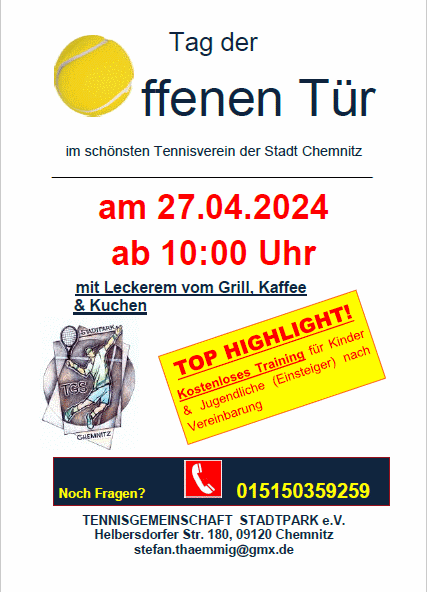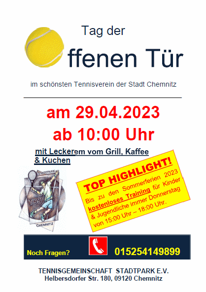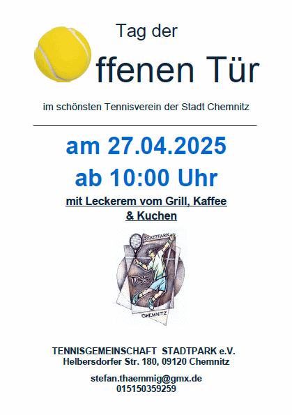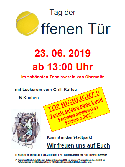 ![]() Anlässlich der Aktion Deutschland spielt Tennis findet unser diesjähriger Tag der offenen Tür am 29.4. ab 10 Uhr statt. Neben kostenlosem Schnuppertraining für Jung und Alt steht unsere Anlage zum freien Spielen zur Verfügung. Für das leibliche Wohl ist den ganzen Tag gesorgt. Wir freuen uns sehr, Sie auf unserer Tennisanlage im Chemnitzer Stadtpark begrüßen zu dürfen. Der Vorstand der TG Stadtpark