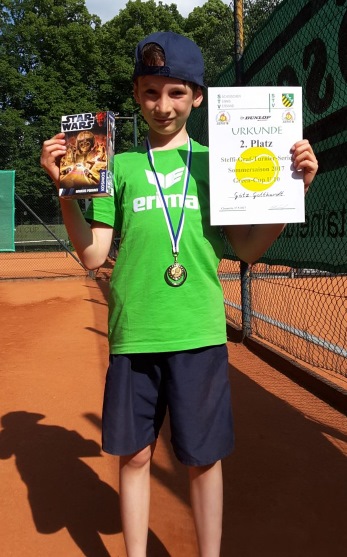Steffi-Graf-Turnier 2017Am 27.5. fand bereits zum dritten Mal ein Steffi-Graf-Turnier im Chemnitzer Stadtpark statt. Bei traumhaften äußeren Bedingungen fanden sich 22 Nachwuchstennisspieler auf unserer Anlage ein, um sich dem Wettstreit Eins gegen Eins zu stellen, Spielerfahrung und Punkte für die Masters-Wertung zu sammeln. ![]() Neben einigen Dauergästen, die sich im Stadtpark bereits bestens auskennen, konnten trotz der deutlich geringeren Teilnehmerzahl als in den vergangenen beiden Jahren auch neue tennisbegeisterte Nachwuchstalente begrüßt werden. Auf sechs Plätzen wurde in den Altersklassen U10 gemischt, U12 weiblich und U12 männlich um jeden Punkt gekämpft und dabei reichlich Schweiß vergossen. Obst und Kuchen sorgten dafür, dass alle schnell wieder zu Kräften kamen und sich der nächsten Herausforderung stellen konnten. Nach tollen kämpferischen Leistungen freuten sich alle Teilnehmer über ihre Urkunden, Medaillen und Sachpreise. Nachdem viel Lob für die Organisation und Betreuung während des Turnieres geerntet wurde, freut sich die TG Stadtpark bereits auf die nächste Auflage im kommenden Jahr. Aus Sicht der TG Stadtpark besonders erfreulich war das Abschneiden von Götz Gotthardt in der U10 im Großfeld. Nach zwei sicheren Siegen kämpfte Götz in seiner Gruppe erbittert um den Sieg, musste sich jedoch am Ende denkbar knapp im Match-Tiebreak geschlagen geben. Wir gratulieren zu einem hervorragenden zweiten Platz. ![]() Götz Gotthardt |
