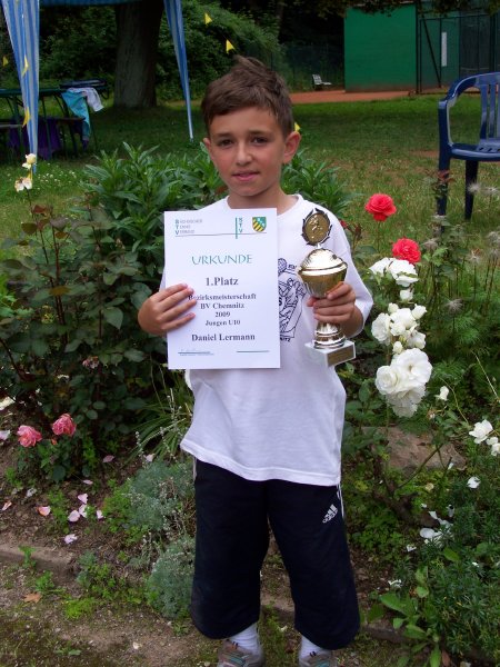 Den dritten Platz belegte nach großartigem Kampf unser erst 10 Jahre altes Vereinsmitglied ( gleichzeitig Bezirksbester Tennisspieler der U 10 ) Daniel Lermann, welcher Schach und Tennis als seine Sportarten gewählt hat. Er besiegte im Spiel um Platz drei den Vereinsvorsitzenden und Dritten des Jahres 2008 Claus Tanneberger. Von Daniel werden wir in den nächsten Jahren sowohl im Tennis, als auch im Schachsport noch Erfolge erwarten können. Alle Teilnehmer haben für 2010 schon Ihre Teilnahme zugesagt. Unser Dank gilt ebenso dem Ehepaar Ayvazyan, welches die Spieler hervorragend versorgte.