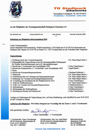 MitgliederinformationAlle Mitglieder, welche zur außerordentlichen Mitgliedervollversammlung am 30.08.2010 nicht dabei waren, können ab sofort die neu gefassten Beschlüsse und Änderungen per E- Mail vom Vorstand anfordern. Ein Versenden per Post erfordert einen vorgefertigten, frankierten und schon adressierten Umschlag. Außerdem können diese Veränderungen und Beschlüsse auch beim Platzmeister Herr Ayvazyan eingesehen werden. Claus Tanneberger - 1. Vorstand