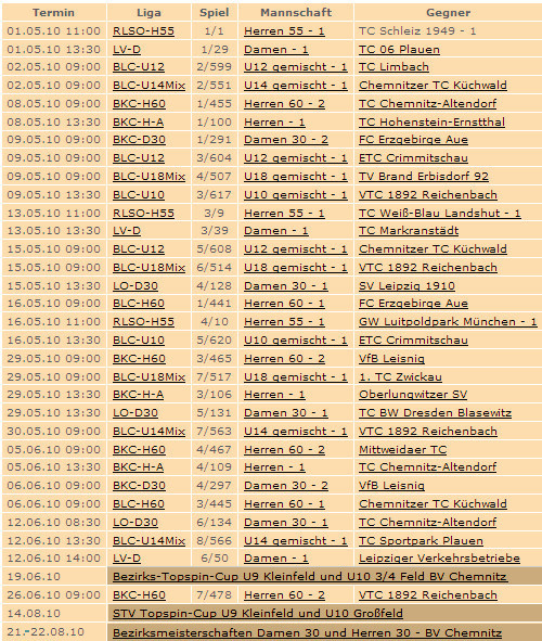 Damen - 1: Verbandsliga Damen Tennis Herren - 1: Bezirksklasse Herren Staffel A Tennis Damen 30 - 1: Oberliga Damen 30 Tennis Damen 30 - 2: Bezirksklasse Damen 30 Tennis Herren 55 - 1: Regionalliga Südost Herren 55 Tennis Herren 60 - 1: Bezirksliga Herren 60 Tennis Herren 60 - 2: Bezirksklasse Herren 60 Tennis U18 gemischt: Bezirksliga U18 gemischt Tennis U14 gemischt: Bezirksliga U14 gemischt Tennis U12 gemischt: Bezirksliga U12 gemischt Tennis U10 gemischt: Bezirksliga U10 gemischt (3/4-Fld) Tennis Wir wünschen alle Mannschaften eine Erfolgreiche Saison!